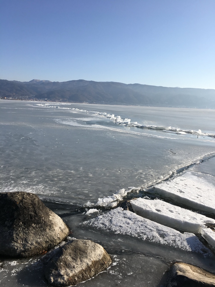 ちなみに前回「御神渡り」ができたのは2018年で、写真は2018年2月に岡谷市湊側から私が撮ったものです。地元でもめったにお目にかかれない御神渡り。つい氷の上に立ってしまいました。